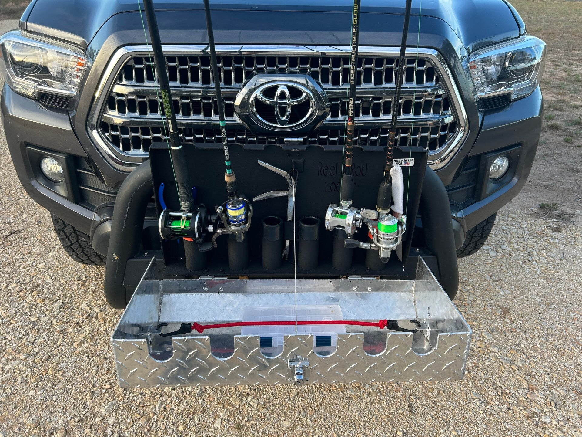 Key latch lock and removable front cover, the box bolts to mounting plate. The entire box is made of aluminum with undercoated back cover. It protects your reels and rods from bugs and debris during transport, while adding security from theft. Holds knifes, pliers and front cover can hold your drinks or gear while you are working on your equipment. It can be mounted to anywhere you desire, brush guard, truck bed, garage wall, boats and RV's.